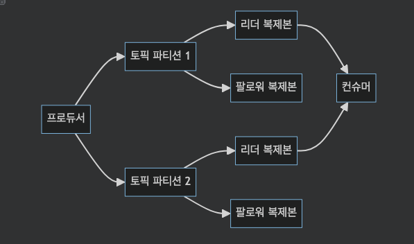 - 브로커는 데이터를 파티션 단위로 저장하고, 각 파티션은 여러 개의 복제본(replica)을 가집니다. 하나의 파티션에는 리더(leader)와 팔로워(follower)가 존재하며, 리더가 데이터를 처리하고 팔로워가 이를 복제합니다.