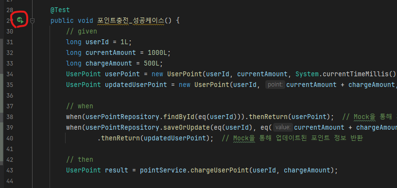 .thenReturn(updatedUserPoint); // Mock을 통해 업데이트된 포인트 정보 반환