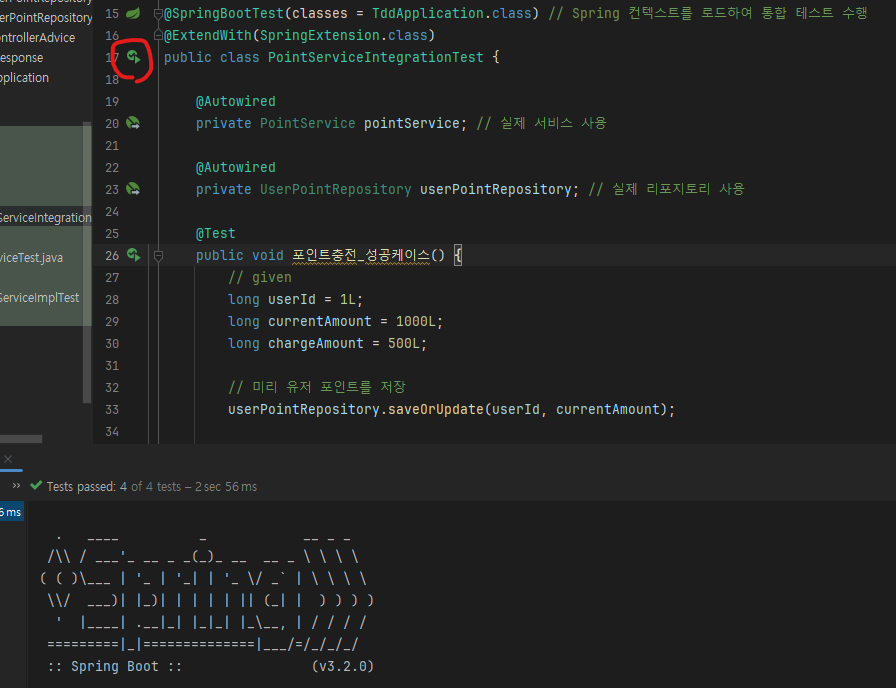 @SpringBootTest(classes = TddApplication.class) // Spring 컨텍스트를 로드하여 통합 테스트 수행